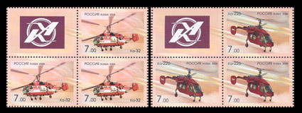 Россия 2008 год, Вертолеты фирмы "Камов" (Ка-32, Ка-226), 2 квартблока с верхним купоном