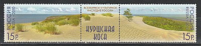 Россия 2010 год, Куршская Коса, 2 марки + купон, сцепкаЦенность и уникальность Куршской косы признана мировым сообществом. В 2000 г. международный российско-литовский объект «Куршская коса» был включен в Список всемирного наследия как «наглядный пример традиционного человеческого поселения или землепользования, характерного для культуры (или культур), в особенности, если она (культура) разрушается под воздействием необратимых перемен». Коса была расценена как «исключительный пример ландшафта, состоящего из песчаных дюн и находящегося под постоянной угрозой со стороны естественных сил, - таких, как ветер и вода. После разрушительного вмешательства человека, угрожавшего существованию косы, путем начатых в XIX в. и продолжающихся по сей день работ по стабилизации и охране, она была восстановлена». Территория Куршской косы официально находится под защитой Конвенции об охране всемирного культурного и природного наследия ЮНЕСКО.