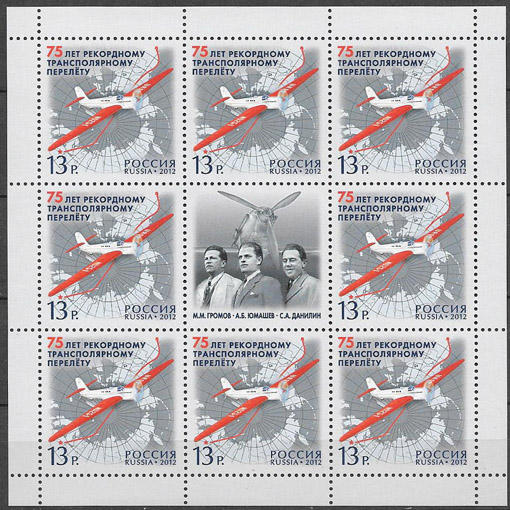 Россия 2012 год. 75 лет рекордному трансполярному перелету. Лист марок