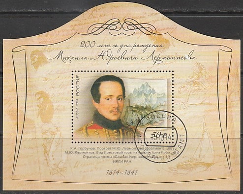 Россия 2014 год. 200 лет со дня рождения М.Ю. Лермонтова, блок КАК (гашёный)