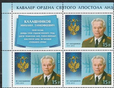 Россия 2014 г, Кавалер Ордена Андр. Первозванного, М. Калашников, квартблок с купоном