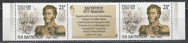 Россия 2015 год, П. Багратион, 2 марки с купоном. (м+к+м. горизонтальная)