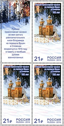 Россия 2016 год. Совместный выпуск РФ и Респ. Словения. Русская православная часовня на перевале Вршич, квартблок с купоном
