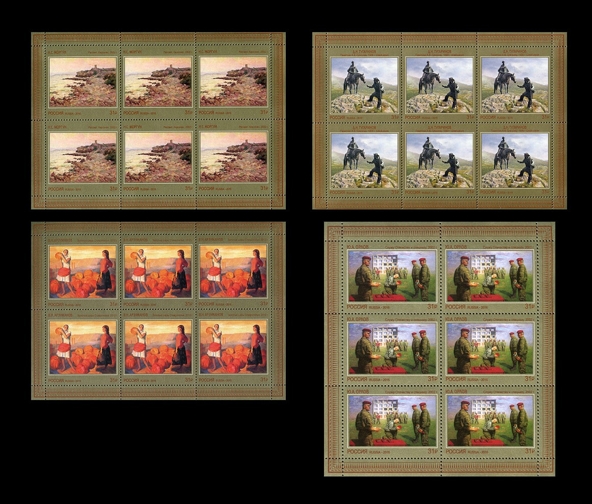 На почтовых марках изображены работы современных авторов: Ю.А. Орлова, В.Н. Арзуманова, Н.С. Моргуна, Д.Н. Тугаринова.