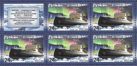 Россия 2017 год, 100 лет ледоколу «Красин», сцепка 5 марок с купоном