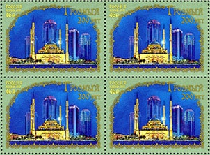 На почтовой марке изображена мечеть «Сердце Чечни» имени Ахмата Кадырова на фоне комплекса высотных зданий «Грозный-сити».