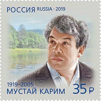 На почтовой марке изображён портрет Мустая Карима на фоне башкирского пейзажа.