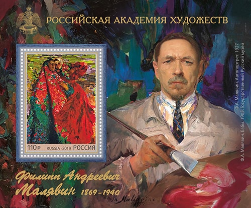 На почтовой марке изображена картина Ф.А. Малявина «Бабы» (1905, ГРМ); на полях почтового блока — «Автопортрет» Ф.А. Малявина (1927) и логотип Российской академии художеств.