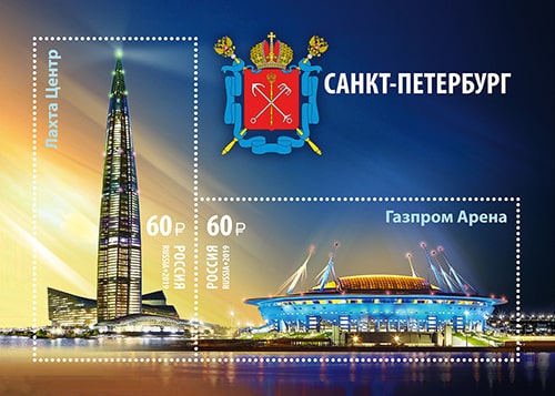 На марках почтового блока изображены современные достопримечательности Санкт-Петербурга — общественно-деловой комплекс «Лахта Центр» и стадион «Газпром Арена», на полях блока — герб Санкт-Петербурга.