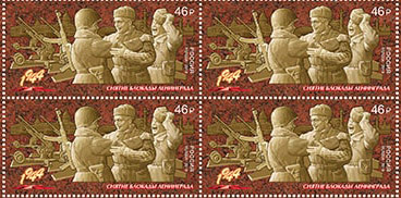 На почтовой марке изображён барельеф с изображением группы советских солдат в период завершения блокады Ленинграда.