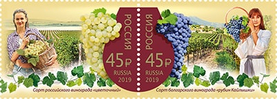 На почтовых марках изображены грозди российского сорта винограда «цветочный» и болгарского сорта винограда «рубин Кайлышки» на фоне пейзажей виноградников.