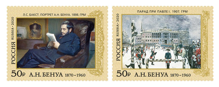 На почтовых марках изображены картины Л.С. Бакста «Портрет А.Н. Бенуа» (1898, ГРМ) и А.Н. Бенуа «Парад при Павле I» (1907, ГРМ).