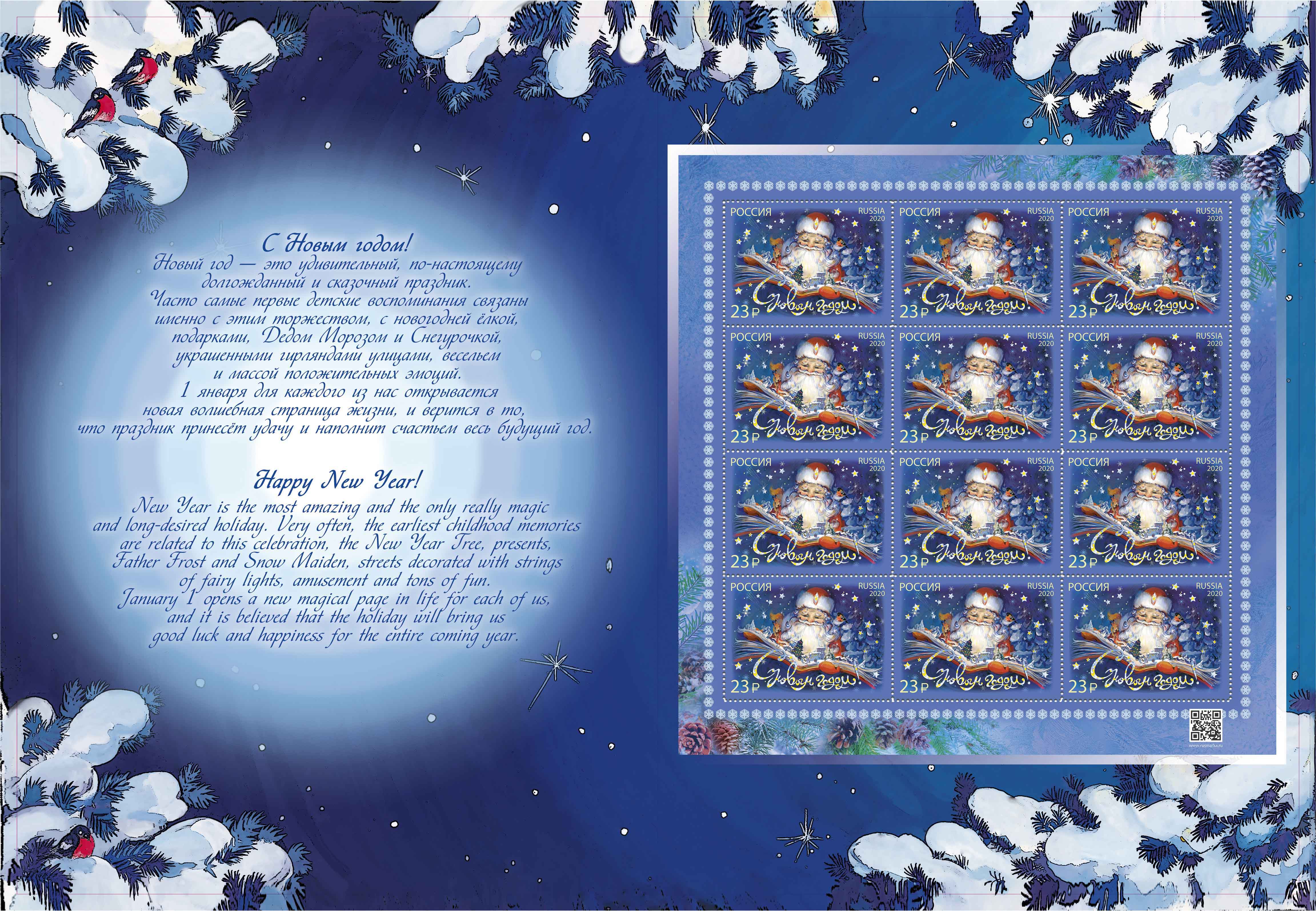 Новогодняя марка 2020 года — победитель всероссийского конкурса рисунка почтовой марки и поздравительных открыток к Новому году и Рождеству для граждан Российской Федерации возраста 18+, профессиональных художников, студентов творческих учебных заведений и непрофессиональных художников (любителей). Почтовая марка издана на основе рисунка победителя конкурса Светланы Киргизовой из Иркутска. На почтовой марке изображён авторский рисунок «Дед Мороз, открыв волшебную книгу, смотрит, как народ радуется наступившему Новому году»
