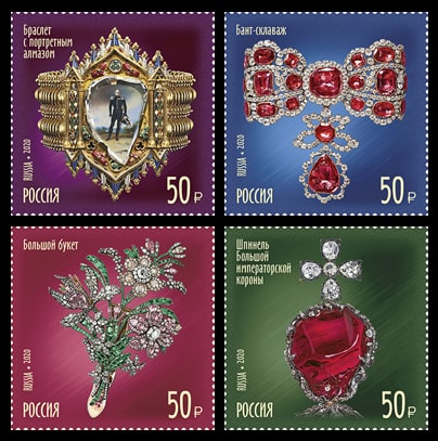На почтовых марках изображены экспонаты из коллекции Гохрана России: бант-склаваж, большой букет, браслет с портретным алмазом и шпинель Большой императорской короны.
