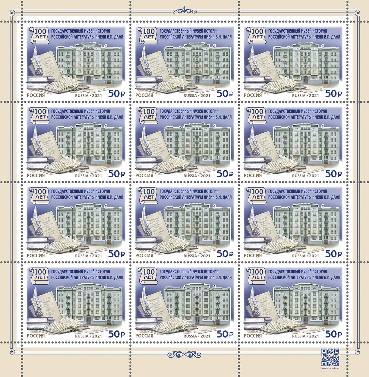 Россия 2021 год. 100 лет Государственному музею истории российской литературы имени В.И. Даля, лист