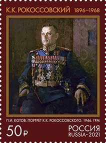 На почтовой марке размещена картина П.И. Котова «Портрет К.К. Рокоссовского» (1946, Государственный Русский музей).