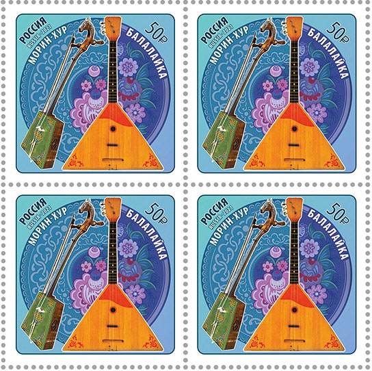 На почтовой марке изображены национальные музыкальные инструменты России и Монголии — балалайка и морин-хур.