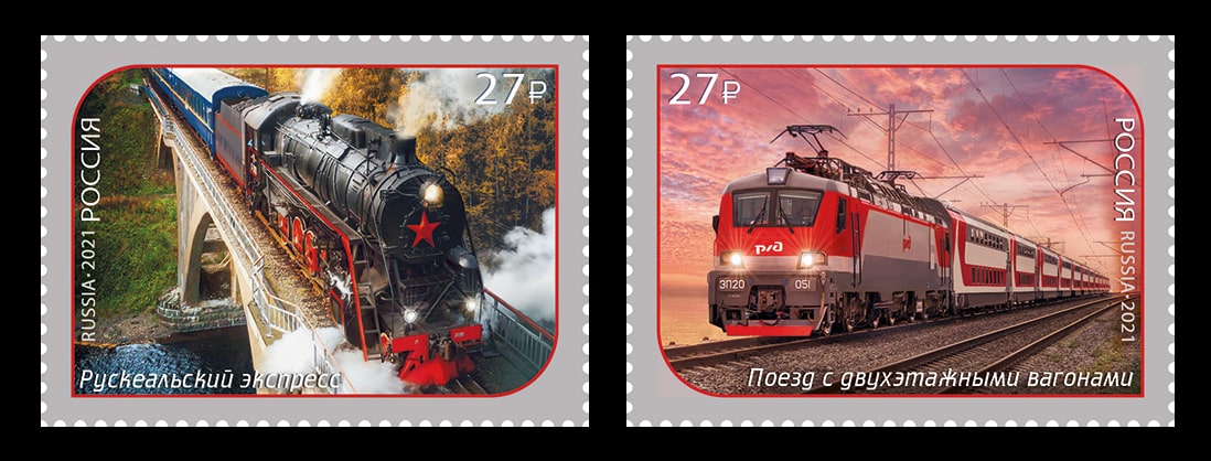 На почтовых марках изображены «Рускеальский экспресс» и поезд с двухэтажными вагонами.