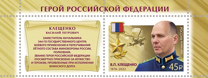 Россия 2022 год. Герой Российской Федерации В.П. Клещенко (1976–2022), 1 марка с купоном АВИА