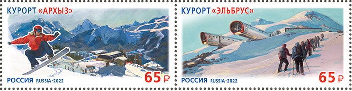 На почтовой марке «Архыз» изображены общий вид курорта и фигура сноубордиста, на почтовой марке «Эльбрус» — высокогорный приют LeapRus и группа туристов-восходителей.