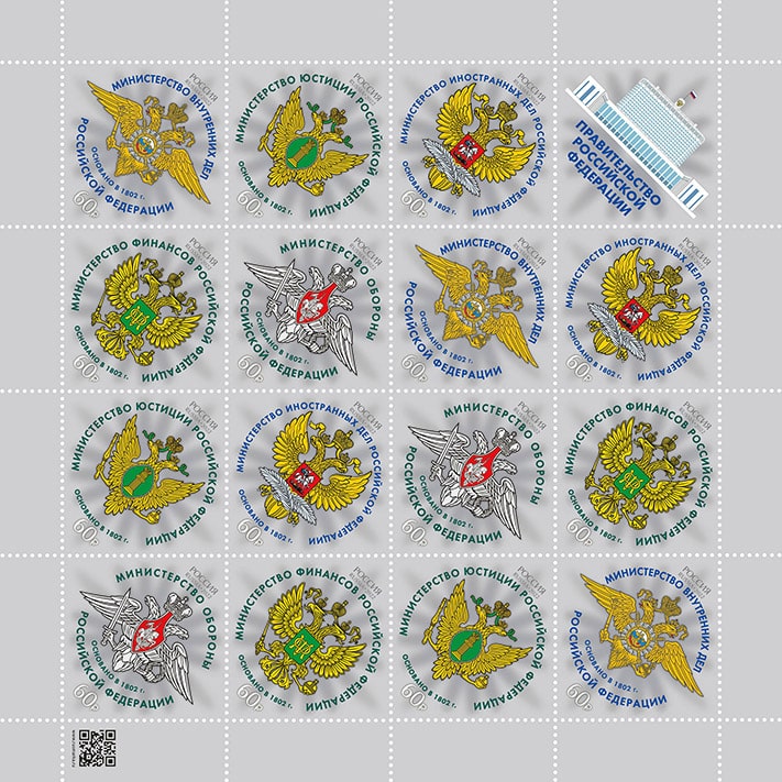 На почтовых марках изображены эмблемы Министерства юстиции Российской Федерации, Министерства финансов Российской Федерации, Министерства иностранных дел Российской Федерации, Министерства обороны Российской Федерации, Министерства внутренних дел Российской Федерации и указаны годы их основания.