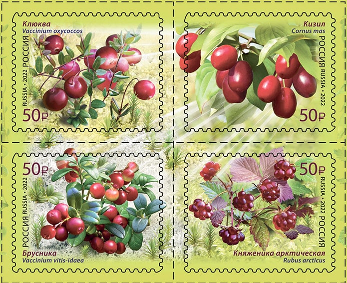 На почтовых марках изображены плоды клюквы, кизила, брусники и княженики арктической.