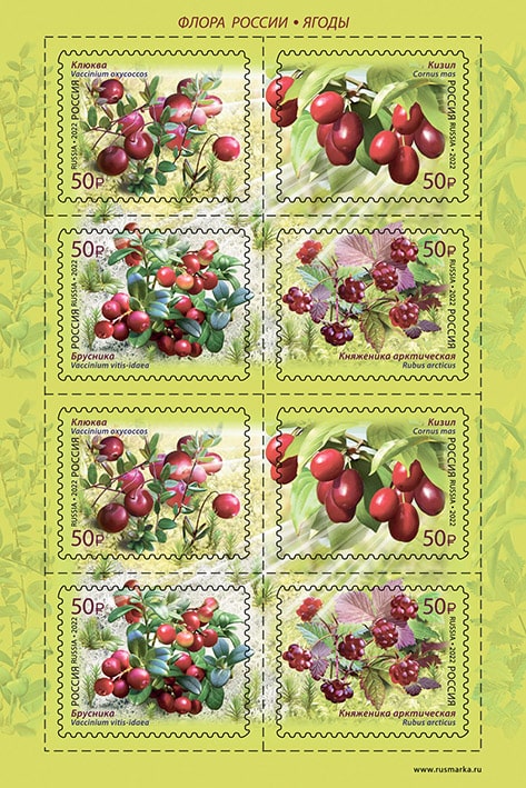 На почтовых марках изображены плоды клюквы, кизила, брусники и княженики арктической.