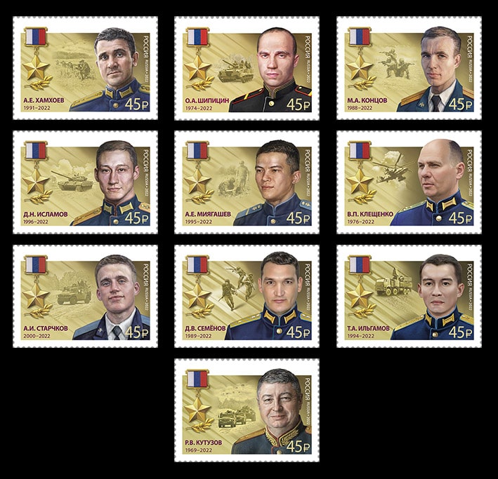 Серия «Герои Российской Федерации». Т.А. Ильгамов (1994–2022), Д.Н. Исламов (1996–2022), В.П. Клещенко (1976–2022), М.А. Концов (1988–2022), Р.В. Кутузов (1969–2022), А.Е. Миягашев (1995–2022), Д.В. Семёнов (1989–2022), А.И. Старчков (2000–2022), А.Е. Хамхоев (1991–2022), О.А. Шипицин (1974–2022)