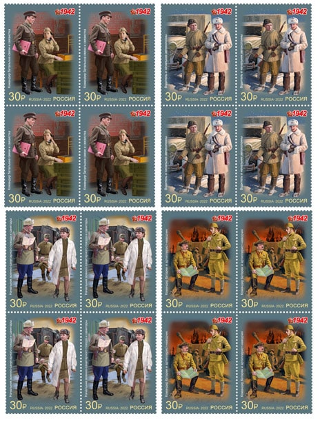 Россия 2022 год. Серия "К 80-летию Победы в Великой Отечественной войне 1941-1945 гг. Военная форма одежды Красной Армии и флота СССР. 1942 г.", 4 квартблока