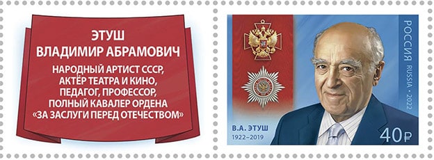 На почтовой марке изображены портрет В.А. Этуша и орден «За заслуги перед Отечеством».