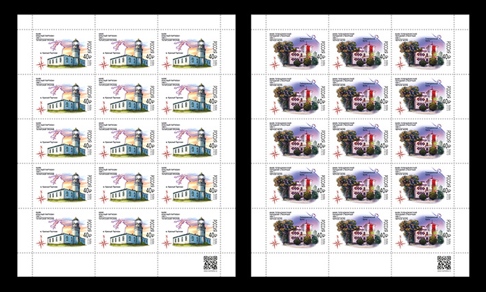 На почтовых марках изображены Геленджикский Передний Створный маяк на фоне карты Геленджикской бухты в Чёрном море и розы ветров и маяк «Красный партизан» на фоне карты мыса «Красный партизан» в Татарском проливе и розы ветров.