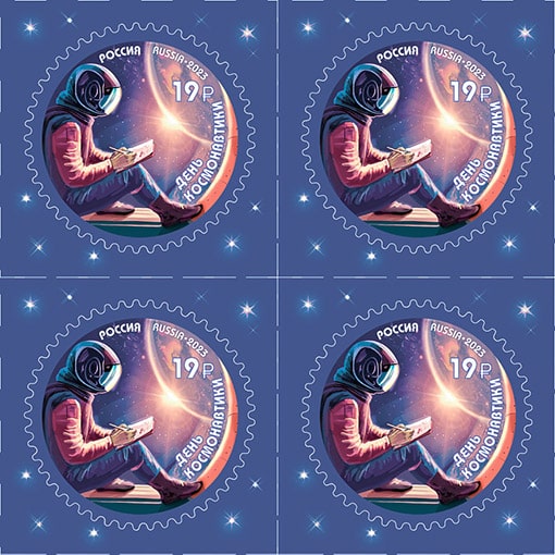 На почтовой марке изображена работа победителя конкурса И. Мирошниченко — образ космонавта на фоне космического пространства.