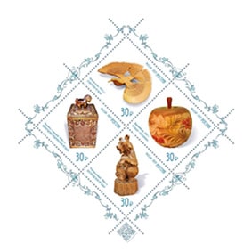 На почтовых марках изображены предметы, выполненные в разных техниках резьбы по дереву: богородская резьба, абрамцево-кудринская резьба, северная резьба и резьба «Татьянка».