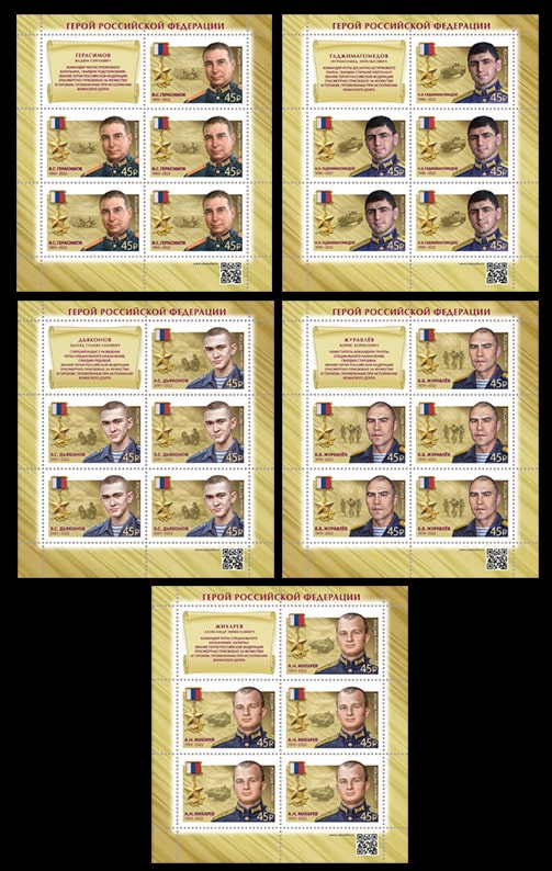 Россия 2023 год. Серия «Герои Российской Федерации». Н.Э. Гаджимагомедов (1996–2022), В.С. Герасимов (1985–2022), Э.С. Дьяконов (2001–2022), А.Н. Жихарев (1993–2022), Б.Б. Журавлёв (1979–2022), 5 листов