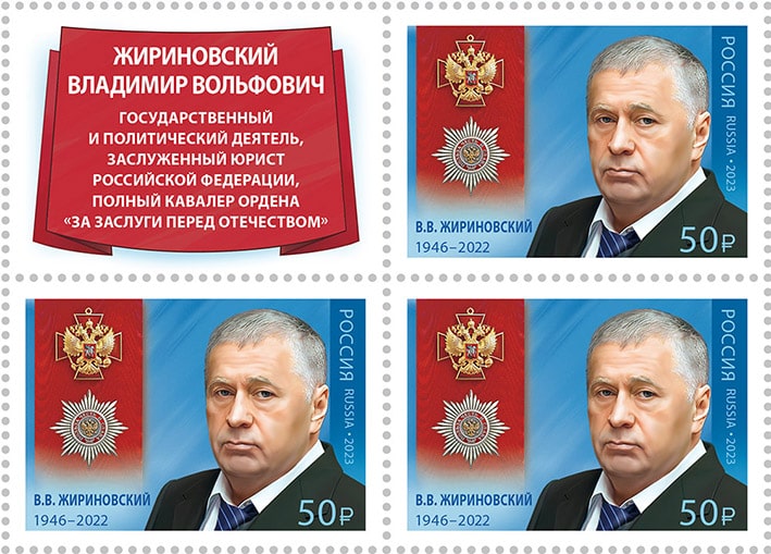 На почтовой марке изображены портрет В.В. Жириновского и орден «За заслуги перед Отечеством».