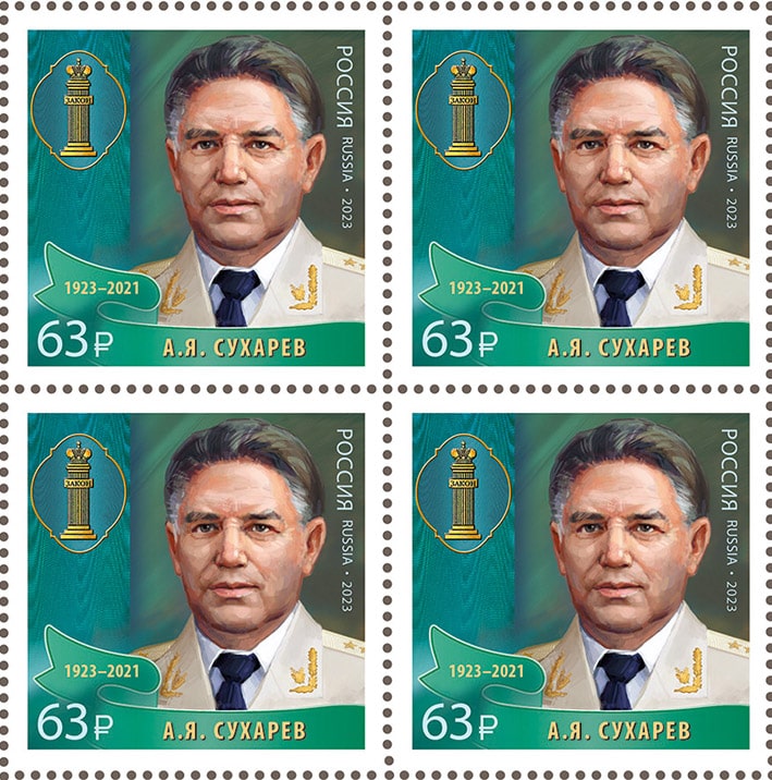 Россия 2023 год. Серия «Выдающиеся юристы России». 100 лет со дня рождения А.Я. Сухарева (1923–2021), учёного-правоведа, государственного деятеля, квартблок