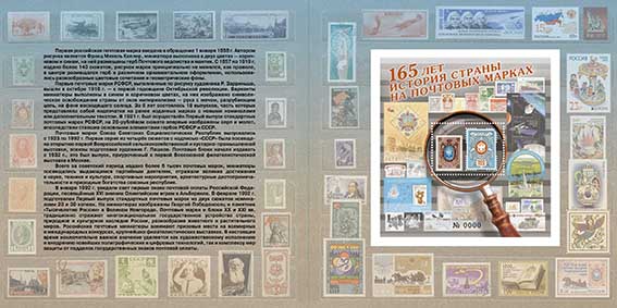 В состав сувенирного набора в художественной обложке "165 лет первой российской почтовой марке (2-ая форма выпуска)" входит почтовый блок №3080-I "165 лет вводу в обращение первых российских почтовых марок. История страны на почтовых марок" с бронзовой пастой и нумерацией.