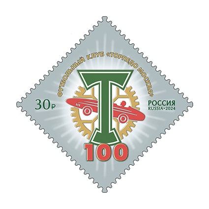 На почтовой марке изображена юбилейная эмблема футбольного клуба «Торпедо Москва».