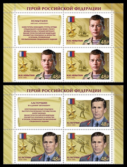 Россия 2024 год. Серия «Герои РФ». В.Е. Ласточкин (1959–1995), М.Ю. Немыткин (1970–1995), 2 квартблока с купоном