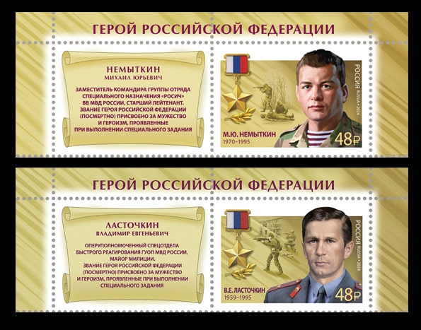 Россия 2024 год. Серия «Герои РФ». В.Е. Ласточкин (1959–1995), М.Ю. Немыткин (1970–1995), 2 марки с купоном