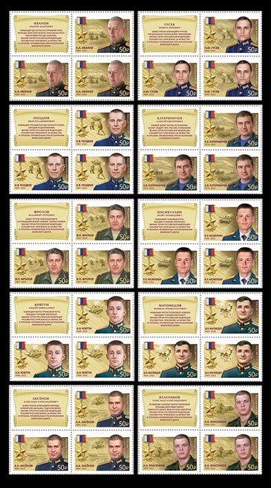 Серия «Герои Российской Федерации». А.А. Аксёнов (1984–2022), А.А. Власенков (1998–2022), Н.Ю. Гусев (1996–2022), А.А. Иванов (1989–2022), А.В. Катериничев (1974–2022), А.Н. Ковтун (1996–2022), Ш.Н. Магомедов (1997–2022), И.Л. Насибуллин (1995–2022), И.В. Поздеев (1985–2022), В.П. Фролов (1967–2022)
