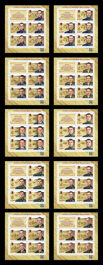 Серия «Герои Российской Федерации». А.А. Аксёнов (1984–2022), А.А. Власенков (1998–2022), Н.Ю. Гусев (1996–2022), А.А. Иванов (1989–2022), А.В. Катериничев (1974–2022), А.Н. Ковтун (1996–2022), Ш.Н. Магомедов (1997–2022), И.Л. Насибуллин (1995–2022), И.В. Поздеев (1985–2022), В.П. Фролов (1967–2022)