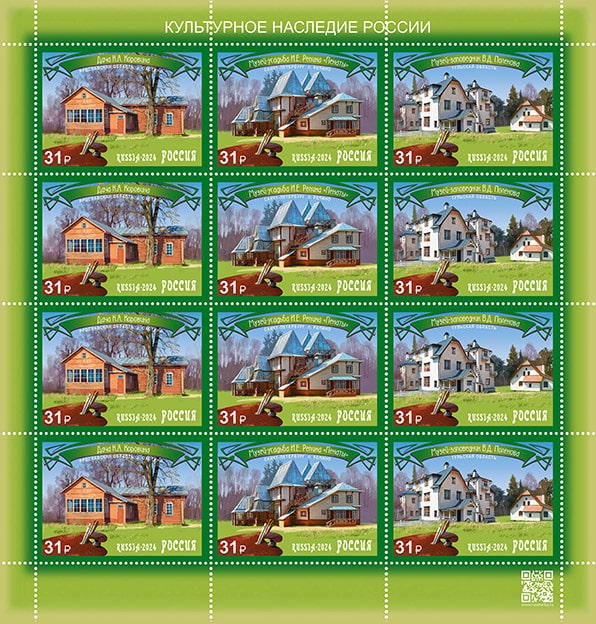 Россия 2024 год. Серия «Культурное наследие России». Дача К.А. Коровина в д. Охотино. Музей-заповедник В.Д. Поленова. Музей-усадьба И.Е. Репина «Пенаты» в п. Репино, лист (ном. 31 р.)