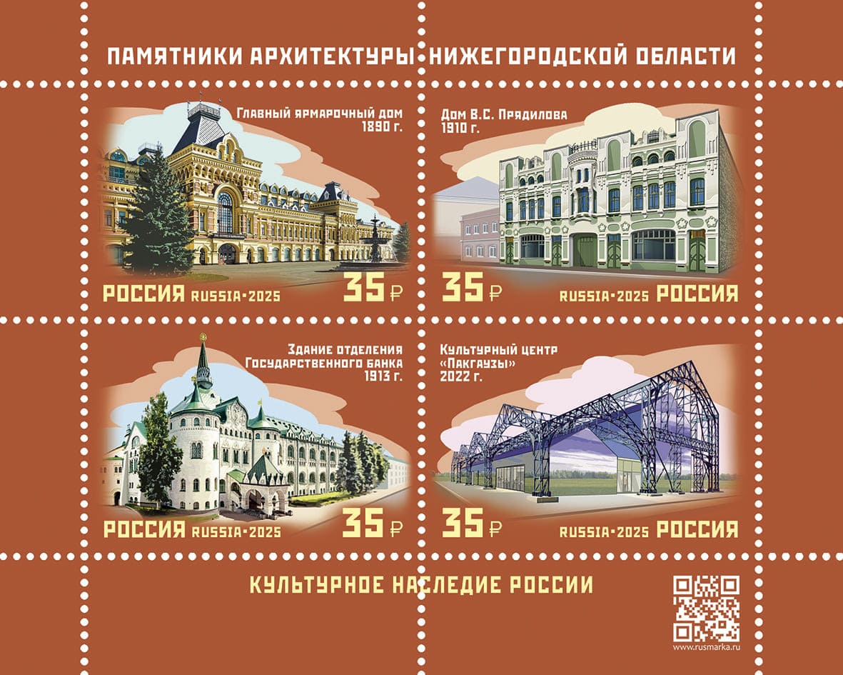 Россия 2025 год. Квартблок. Архитектурное наследие России. Памятники архитектуры Нижегородской области, лист (ном. 140 ₽)