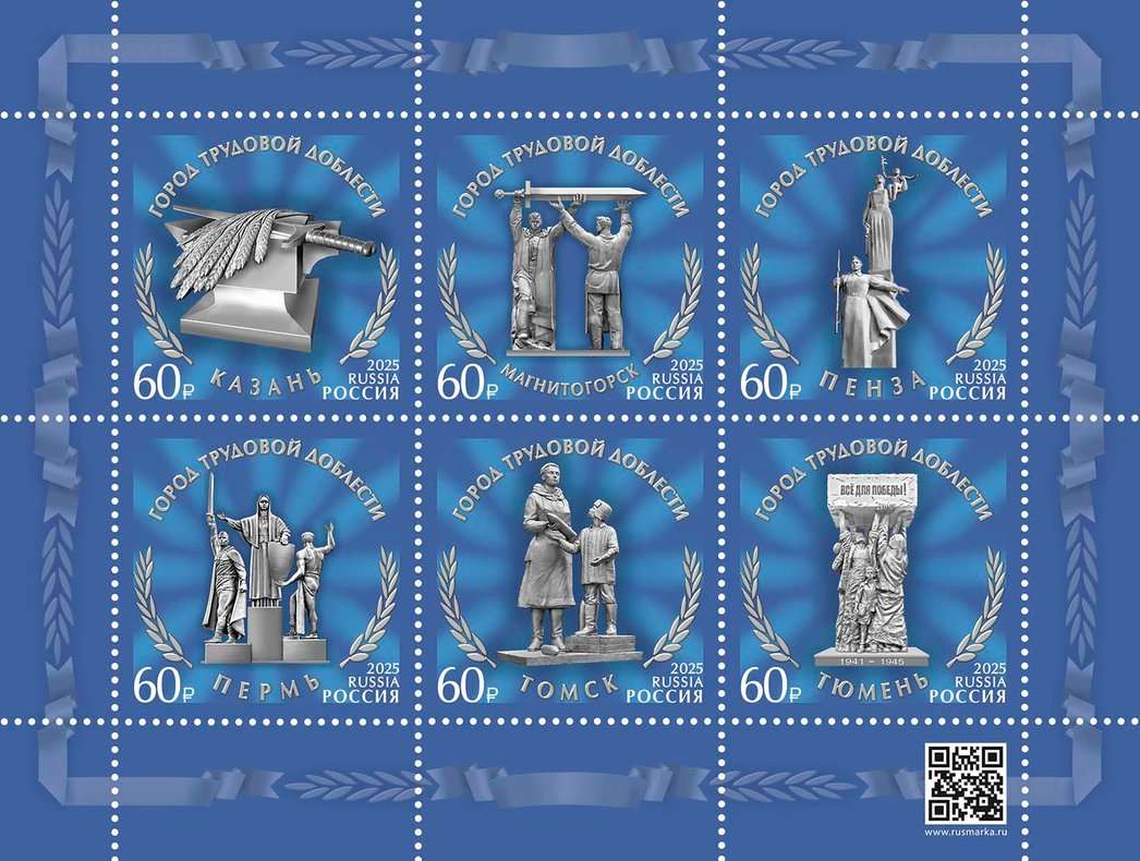 Россия 2025 год. Города трудовой доблести. Казань, Магнитогорск Челябинской области, Пенза, Пермь, Томск, Тюмень, лист (ном. 60 ₽)