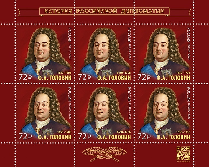 Россия 2025 год. Серия «История российской дипломатии». 375 лет со дня рождения Ф.А. Головина (1650–1706), государственного деятеля, дипломата, лист (ном. 72 р.)