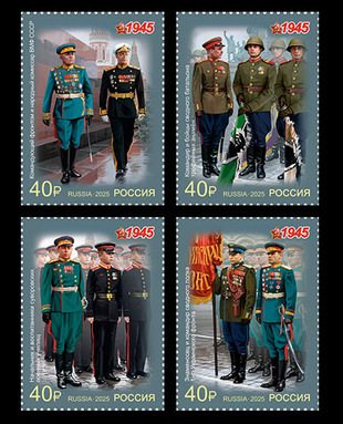 Россия 2025 год. Серия «К 80-летию Победы в ВОВ 1941–1945 гг. Военная форма участников парада Победы 1945 г.», 4 марки (ном. 40 р.)