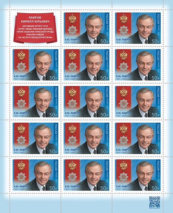 Россия 2025 год. Серия «Кавалеры ордена "За заслуги перед Отечеством"». 100 лет со дня рождения К.Ю. Лаврова (1925–2007), актёра, народного артиста СССР, ном. 50 р., лист