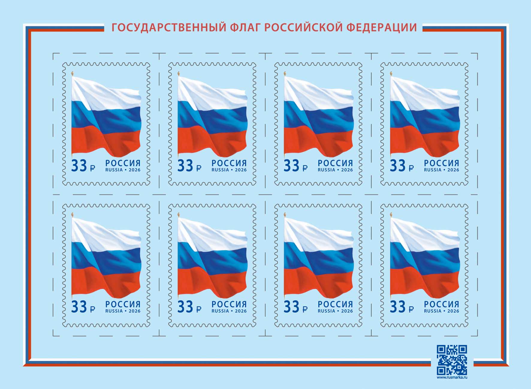 Россия 2026 год. Государственный флаг Российской Федерации, 1 лист из 8 марок (ном.33 ₽)