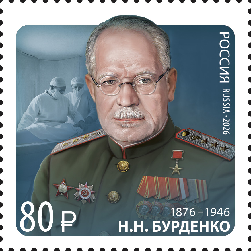 Россия 2026 год.150 лет со дня рождения Н.Н. Бурденко (1876–1946), хирурга, организатора здравоохранения, основателя нейрохирургии, 1 марка (ном.80 ₽)